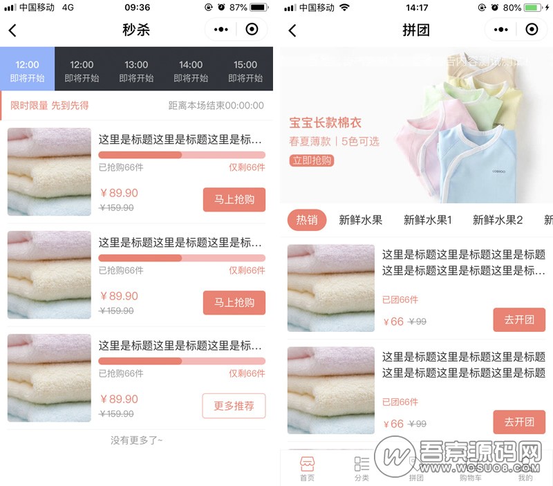 主要功能:快速购买、附近门店、视频专区、优惠券、个人中心、分销、拼团、砍价、预约、积分商城、限时秒杀、多商户、商家管理后台。